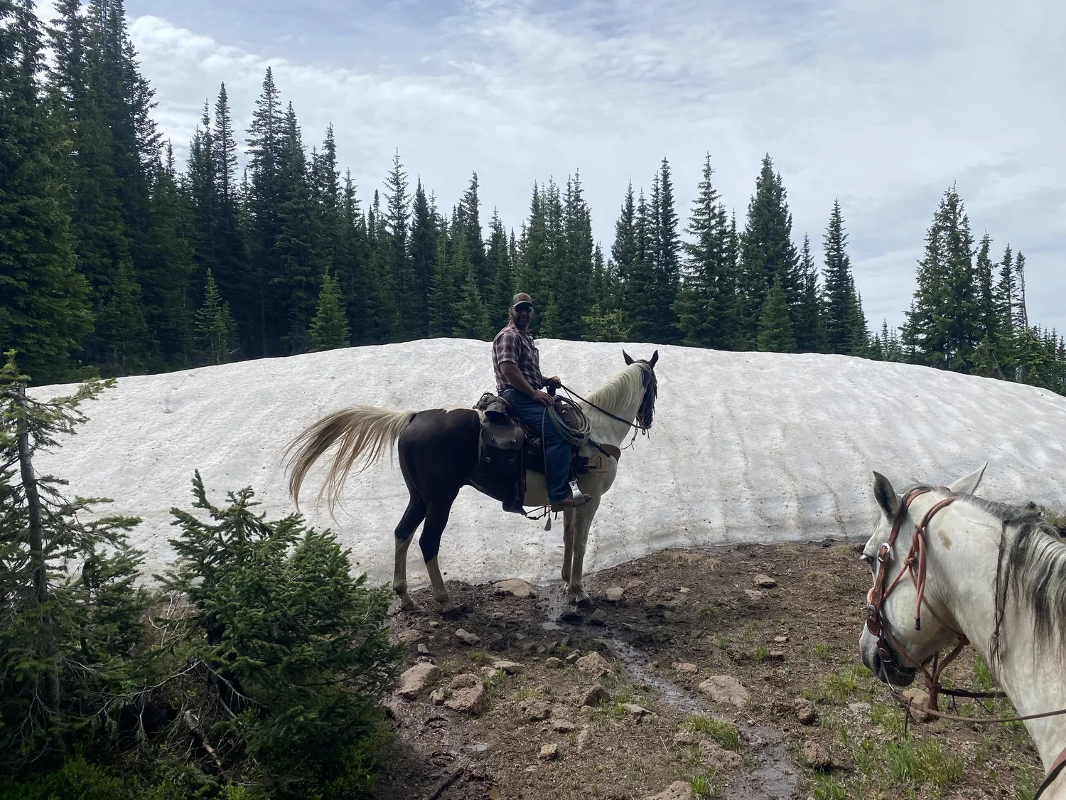 Smiley, well mounted on Tonka, in front of a big snow drift on July 3rd