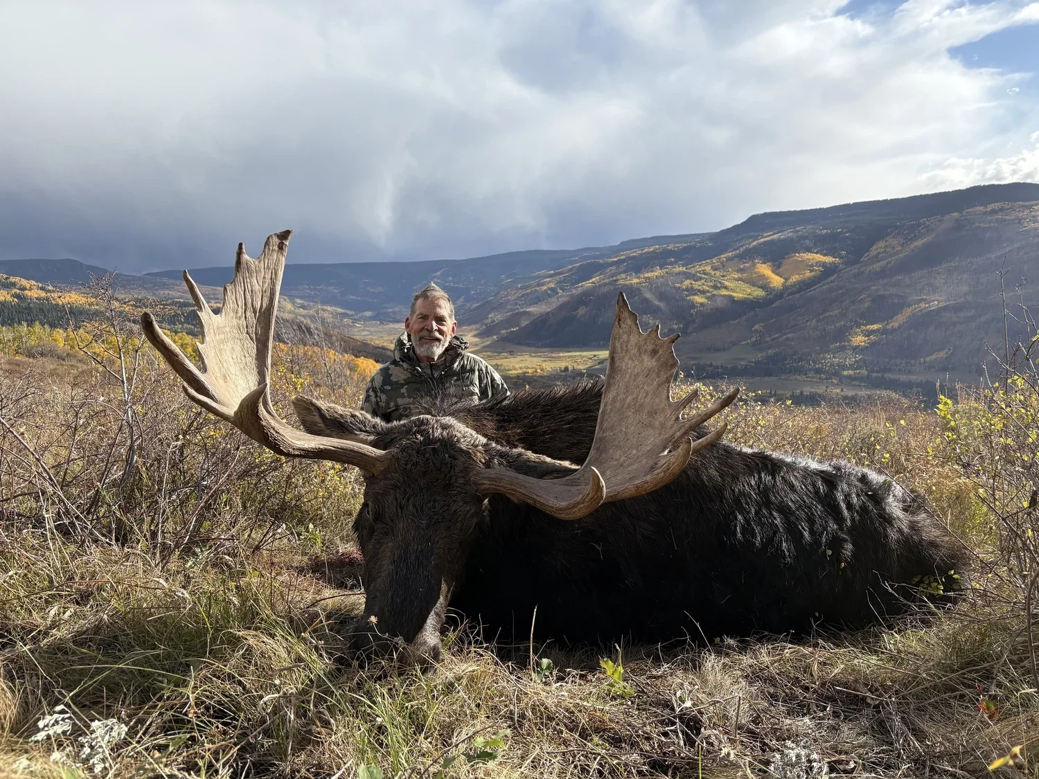 We guided one GMU 12/23/24 moose hunter. Bruce, the hunter, called me the day we had to evacuate looking for an outfitter as he was next inline for a returned coveted bull moose tag. Summer scouting and spending time guiding elk hunters usually turns up a lot of moose. Based on what we saw and reports from some of our drop camp hunters, we decided to hunt out of one of the drop camps verses day hunting from the ranch or a spike camp. The 1st full day was mostly spent in camp due to weather. A couple of hours before sunset, the weather broke and we decided to go out for a short evening hunt. Thank goodness we did! We spotted this bull from about 450 yards and were able to call him into under 35 yards not a stones throw away from the trail making it possibly the easiest moose pack out to date!