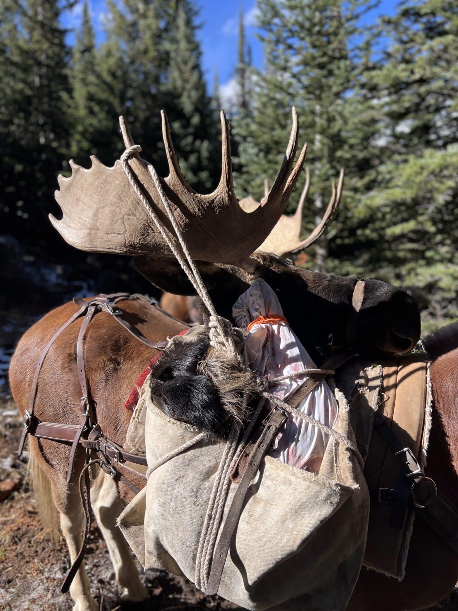 Myron showing off a nice 2nd Rifle bull from one of the drop camps. The young mule pictured is, Dee. This was his first time packing antlers. He did great!